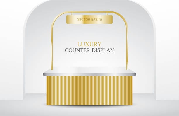luxury shiny gold counter kiosk with hanging sign 3d illustration vector for putting your object